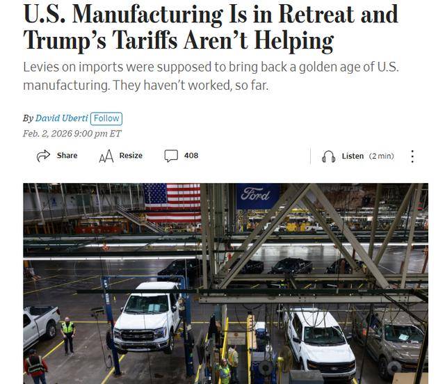 《华尔街日报》近日刊文指出,美国政府曾承诺通过加征关税和推出产业促进政策推动制造业复兴,开 启"美国制造的黄金时代"。但最新数据显示,这一目标不仅尚未实现,美国制造业的整体态势反而持续 走弱。 △《华尔街日报》网站报道截图 文章援引SGH宏观顾问公司美国经济学家乔什·莱纳的话表示,美国制造业"从未真正恢复到疫情前水 平"。他指出,汽车和芯片制造商在过去一年裁减了数万名员工,整体为持续性的、渐进式收缩裁员。 △《华尔街日报》网站报道截图 类似压力也出现在零部件制造和运输相关行业。总部位于北卡罗来纳州夏洛特的一家制造商在全球运营 23家工厂,其首席执行官哈罗德·比维斯指出,关税在短期内推高了钢铁和铝材成本,也压缩了企业向 数据中心、电气设备等新领域投资的能力。 根据美国官方统计,自美方宣布所谓"解放日"关税政策以来,制造业岗位已连续8个月减少。自2023年 以来,该行业累计流失岗位超过20万个,美国制造业就业人数降至新冠疫情结束以来的最低水平。 报道指出,制造业活动疲软在多项指标中均有体现。美国供应管理协会(ISM)发布的制造业指数在截 至去年12月的26个月中持续处于萎缩区间。尽管今年1月新订单和产出数据出现短 ...