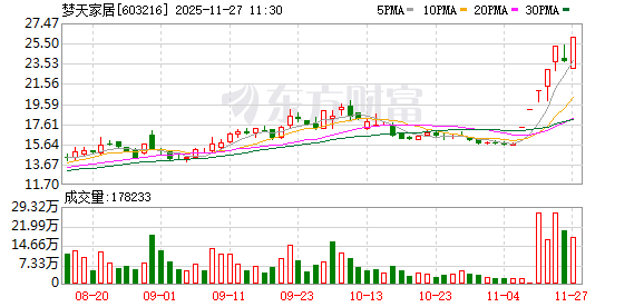 11月24日晚间,四连板梦天家居披露股票交易异常波动公告称,公司股价累计涨幅较大,现已严重偏离 上市公司基本面。2025年11月19日至2025年11月24日,公司股票连续4个交易日涨停,其间累计涨幅达 46.43%,上证指数同期累计涨幅-2.62%,公司股价上涨幅度已显著偏离指数。近期不存在任何控制权转 让和任何资产重组的计划安排。 编辑 | 钉钉 截至目前公司总股本为22269万股,公司控股股东浙江梦天控股有限公司、实际控制人余静渊、范小珍 及其一致行动人(协议转让前)合计持有公司股票16600万股,占公司总股本的74.54%;公司剩余外部 流通盘较小,可能存在非理性炒作风险。 ...