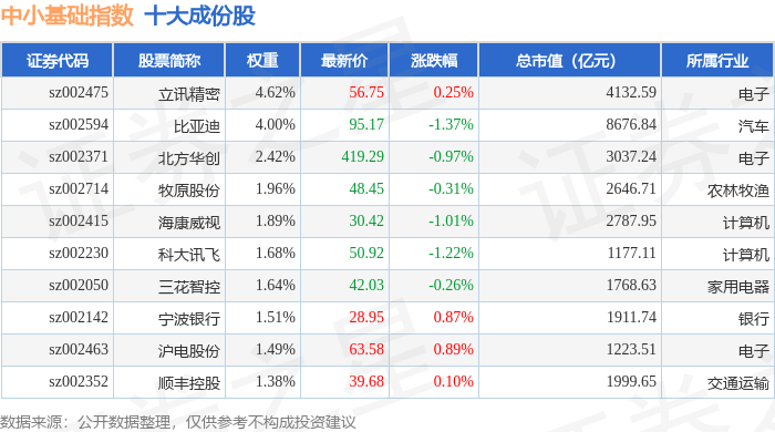 证券之星消息,11月19日,中小基础(399623)指数报收于8725.31点,跌0.43%,成交2098.26亿元,换 手率2.01%。当日该指数成份股中,上涨的有94家,朗姿股份以10.0%的涨幅领涨,下跌的有250家,瑞 达期货以9.99%的跌幅领跌。 中小基础(399623)指数十大成份股详情如下: | 证券代码 | 股票简称 | 权重 | 最新价 | 涨跌幅 | 总市值(亿元) | | 所属行业 | | --- | --- | --- | --- | --- | --- | --- | --- | | sz002475 | 立讯精密 | 4.62% | 56.75 | 0.25% | | 4132.59 | 电子 | | sz002594 | 比亚迪 | 4.00% | 95.17 | -1.37% | | 8676.84 | ● 汽车 | | sz002371 | 北方华创 | 2.42% | 419.29 | -0.97% | 4 V | 3037.24 | 电子 | | sz002714 | 牧原股份 | 1.96% | 48.45 | -0.31% | | 2646.71 | 农林牧渔 | ...