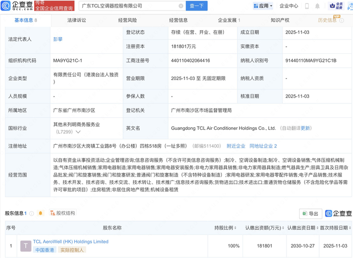 Core Insights - Guangdong TCL Air Conditioner Holdings Co., Ltd. has been established with a registered capital of approximately 1.818 billion RMB, focusing on investment activities and the manufacturing and research of household appliances [1][2]. Company Information - The legal representative of the company is Peng Pan, and it is wholly owned by TCL AeroWell (HK) Holdings Limited [1]. - The company is registered in Nansha District, Guangzhou, Guangdong Province, with its registered address at No. 8, Industrial Road, Dagang Town, Nansha District [2]. - The company operates as a limited liability company with no fixed business term, established on November 3, 2025 [2]. Business Scope - The business scope includes investment activities with self-owned funds, manufacturing and sales of refrigeration and air conditioning equipment, household appliances, and various consulting services [2]. - Additional activities include the sale and installation of household appliances, production of gas appliances, and technical services such as technology development and consulting [2].