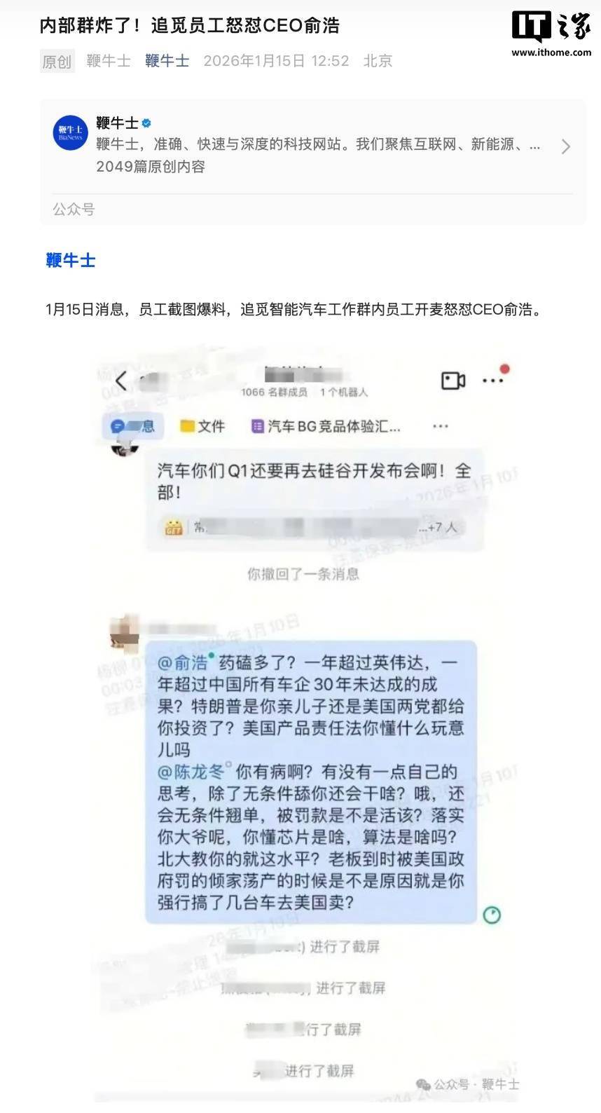 IT之家 1 月 15 日消息,据鞭牛士报道,今天网传"追觅智能汽车工作群内员工怒怼 CEO 俞浩"。 网传截图显示,该员工 @俞浩 并表示,"一年超过英伟达,一年超过中国所有车企 30 年未达成的成果?美国产品责任法 你懂吗?" 同时,该员工还 @ 另一员工称,"有没有一点自己的思考?你懂芯片是啥,算法是啥吗?北大教你的就这水平?老板到时 被罚的倾家荡产的时候是不是原因就是你强行搞了几台车去美国卖?"不少员工对此言论进行了截屏。 参考IT之家 1 月 12 日报道,追觅科技创始人兼 CEO 俞浩发朋友圈表示,"追觅生态将成为人类历史上第一个百万亿美金 的公司生态。" 此外,针对市场监管总局依法对携程涉嫌垄断展开立案调查一事。俞浩在朋友圈发文称追觅将推出对标携程的产品,让携 程不再垄断。 IT之家注意到,自去年下半年以来,追觅已先后入局牙刷、显示器、汽车、洗衣机、冰箱、手机、空调、燃气灶、热水 器、洗碗机、净水器、宠物用品、抽油烟机、耳机、洗车机、剃须刀、智能电视、音箱、智能戒指、体脂秤、路由器、移 动电源、智能眼镜、家装灯具、运动相机、空气炸锅、咖啡机、厨师机等市场。 ...