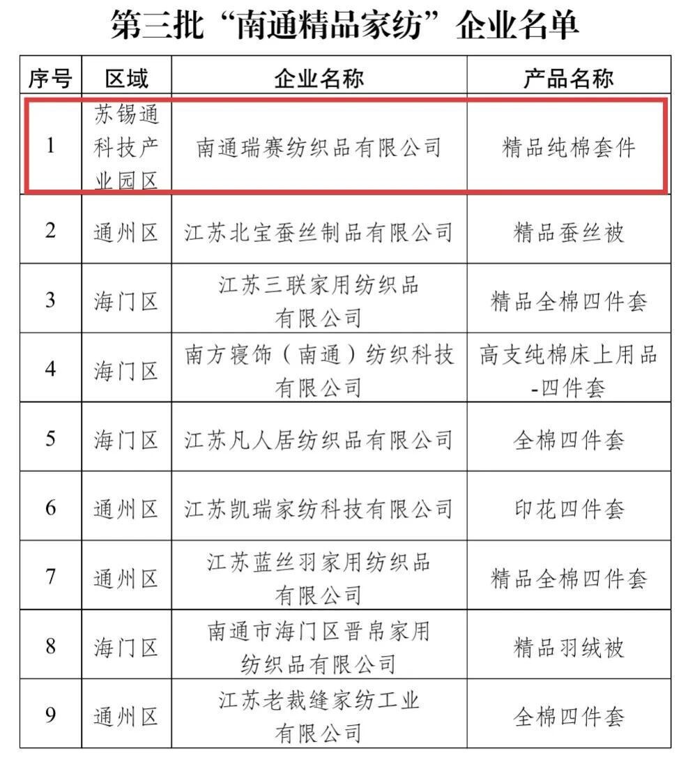 此次通过"南通精品家纺"论证,是对雪尼尔品牌综合实力的全面认可。在产品创新上,品牌持续加大研发投入,引入先进技术与设计理念, 既推出保暖性与透气性兼具的高端被芯,也打造适配简约、法式、中古风等多元家居风格的时尚套件,实现功能性与美观度的双重升级;在 品质管控上,品牌坚守"匠心造好物"的理念,建立从原材料筛选到成品交付的全生命周期质量追溯体系,严格遵循国家质量管理标准,2024 近日,南通市市场监督管理局正式揭晓第三批"南通精品家纺"认证名单,雪尼尔品牌主体企业——南通瑞赛纺织品有限公司凭借深厚的品牌 积淀、卓越的产品矩阵与严苛的品质管控,成功通过权威论证,为"南通家纺"区域公共品牌注入强劲品牌动能,也彰显了雪尼尔在家纺行业 的标杆地位。 | 序号 | 区域 | 企业名称 | 产品名称 | | --- | --- | --- | --- | | 1 | 苏锡迪 科技产 | 南通瑞赛纺织品有限公司 | 精品纯棉套件 | | | 业园区 | | | | 2 | 通州区 | 江苏北宝蚕丝制品有限公司 | 精品蚕丝被 | | 3 | 海门区 | 江苏三联家用纺织品 | 精品全棉四件套 | | | | 有限公司 | | ...