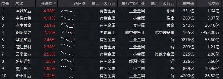 今日(2月3日)揽尽有色金属行业龙头的有色ETF华宝(159876)场内价格盘中涨超4.1%,现涨2.2%,终结此前的2连跌。 成份股方面,国城矿业、中稀有色领涨超4%,湖南黄金涨逾3%,钢研高纳、紫金矿业、楚江新材等个股跟涨。权重股方面,紫金矿业涨超2%,洛阳钼 业涨逾1%。 | 序号 | 名称 | 涨跌幅 ▼ | 两日图 | 申万一级行业 | 申万二级行业 | 申万三级行业 | 总市值 | 成交额 | | --- | --- | --- | --- | --- | --- | --- | --- | --- | | 1 | 国城矿业 | 4.38% | | 有色金属 | 工业会属 | 铝锌 | 331亿 | 1.64亿 | | 2 | 中标有色 | 4.11% | mi | 有色金属 | 小金属 | 稀土 | 269Z | 3.07亿 | | | 份据歷贤 | 3.81% | M | 有色会属 | 普金属 | 商金 | 54075 | 26.18亿 | | | 钢研高纳 | 2.78% | mil | 国防军工 | 航空装备Ⅱ | 航空装备Ⅱ | 165亿 | 7952.00万 | | 34567 | 崇 ...