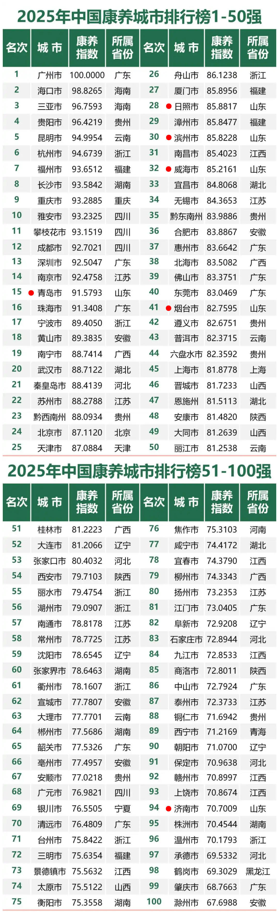 近日在河北举行的第四届中国康养大会,发布了"2025年中国康养城市排行榜百强"。榜单显示,广州市、海口市、三亚市、贵阳市、昆明市、杭州市、福 州市、长沙市、重庆市、雅安市、攀枝花市、成都市、深圳市、南京市、青岛市成为最新的康养城市十五强城市。值得关注的是,在前15名中,青岛成为 北方城市中的独苗。 青岛依托黄海之滨的优质生态资源,空气质量常年位居全国前列,拥有崂山、金沙滩等国家级生态景区。作为计划单列市,其医疗资源雄厚,青大附院、 市立医院等三甲医院密集,并积极建设国家区域医疗中心。同时,青岛大力发展"海洋+康养"产业,推动温泉疗养、滨海旅居养老和智慧健康社区建设。 政策层面,青岛入选全国积极应对人口老龄化重点联系城市,出台多项支持康养产业发展的专项规划,吸引社会资本布局高端养老项目,形成集生态、医 疗、旅游、科技于一体的综合康养体系。 2025年中国康养城市排行榜51-100强 | 名次 | 城 市 | 康养 | 所属 | 名次 | 城 市 | 康乔 | 所属 | | --- | --- | --- | --- | --- | --- | --- | --- | | | | 指数 | 集( | | | 指数 ...