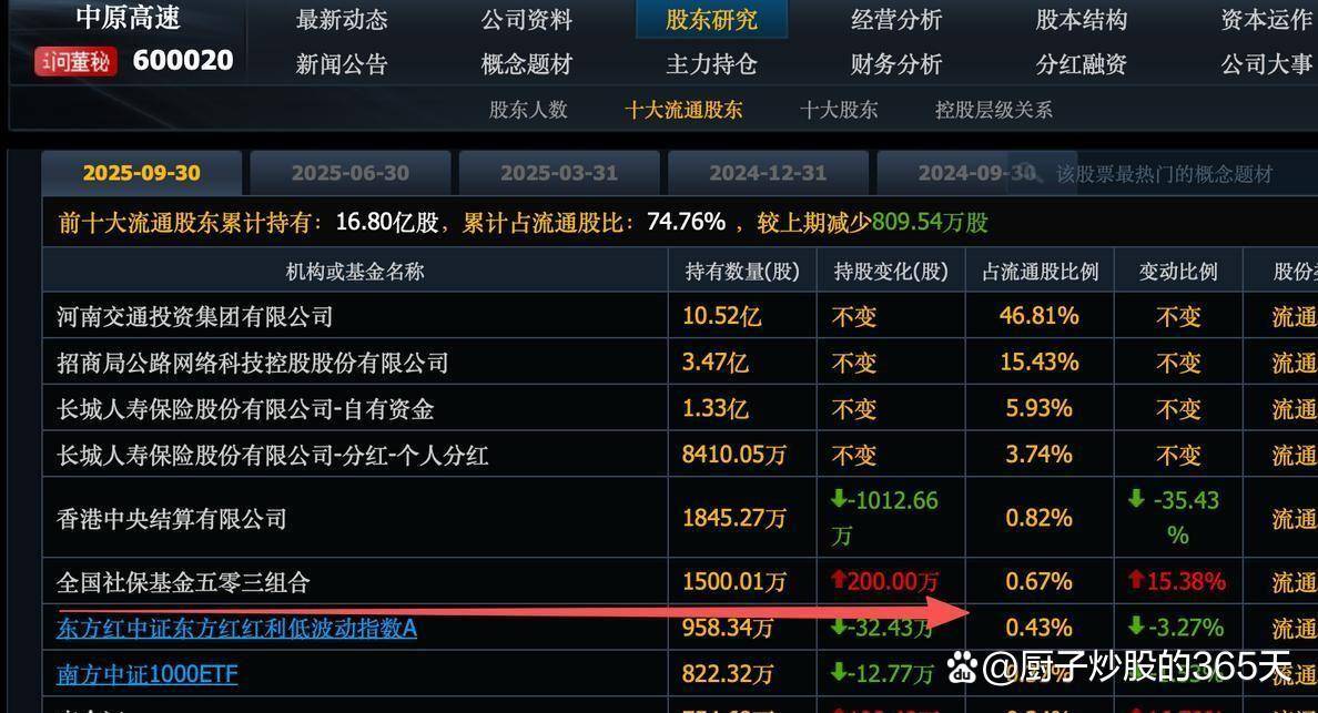 在A股4000点震荡、科技股大起大落的2025年,有一类资金却悄然潜入了股价甚至低于公司每股净资产的"破净股"中。 2025年第二季度,社保基金新进了6 家这样的公司,它们清一色具备股价低、估值低的特点,比如皖能电力的股价比其净资产还低,股息率却超过4.5%。 | 中原高速 | 最新动态 | 公司资料 | 股东研究 | 经营分析 | 股本结构 | | | --- | --- | --- | --- | --- | --- | --- | | i间击秘 600020 | 新闻公告 | 概念题材 | 主力持仓 | 财务分析 | 分红融资 | | | | | 股东人数 | 十大流通股东 | 十大股东 | 控股层级关系 | | | 2025-09-30 | 2025-06-30 | 2025-03-31 | 2024-17-61 | | 2024-09-30 该股票最热门的概 | | | 前十大流通股东累计持有:16.80亿股,累计占流通股比:74.76%,较上期减少809.54万股 | | | | | | | | 机构或基金名称 | | | 持有数量(股) | 持股变化(股) | 占流通股比例 | 变动比例 | | ...