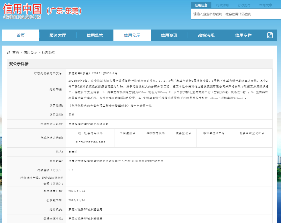 该罚单的处罚事由显示,2025年9月9日,东莞市安监站执法人员对该项目进行监督检查时发现,1、2、3号厂房正在进行2层模板安装,6号地下室正在进 行基坑土方开挖,其中2号厂房2层梁板模板支撑搭设高度为7.9m,属于危险性较大的分部分项工程,施工单位科信达建设集团未严格按照专项施工方案 组织施工,存在以下安全隐患: 1、跨中支撑架间距方案为600mm,现场为900mm;2、水平剪刀撑设置与方案不符(方案为3道,现场仅1道);3、竖向斜杆布置型式与方案不符,未按方 案要求间隔3跨设置;4、支撑架可调托撑伸出顶层水平杆的悬臂长度超过 650mm(现场实测970mm)。 对此,处罚机关依据《危险性较大的分部分项工程安全管理规定》第十六条第一款,对科信达建设集团罚款人民币10000元。行政处罚决定书文号:东建 罚字(安监)〔2025〕第034-1号。 齐鲁晚报·齐鲁壹点记者于信用中国(广东·东莞)信用公示栏获悉,11月24日,中儒科信达建设集团有限公司(下称"科信达建设集团")收到罚单,处罚 类别是"罚款",处罚机关为东莞市住房和城乡建设局。 | | | | 信用信息 | 行政治司 | 行政处罚 | 站内文章 | | ...