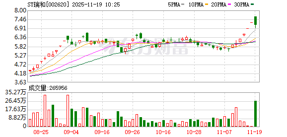 ST瑞和再度涨停,7个交易日内录得6个涨停,累计涨幅为35.17%,累计换手率为14.97%。截至9:25, 该股今日成交量12.39万股,成交金额94.29万元,换手率0.04%。最新A股总市值达28.73亿元,A股流通 市值24.00亿元。 | 日期 | 当日涨跌幅(%) | 换手率(%) | 主力资金净流入(万元) | | --- | --- | --- | --- | | 2025.11.18 | 5.07 | 0.19 | 145.91 | | 2025.11.17 | 5.02 | 0.37 | 36.98 | | 2025.11.14 | 4.95 | 1.69 | 79.07 | | 2025.11.13 | 5.03 | 2.01 | 763.46 | | 2025.11.12 | 0.85 | 6.37 | -351.24 | | 2025.11.11 | 4.97 | 4.32 | 143.63 | | 2025.11.10 | -1.75 | 2.67 | -429.78 | | 2025.11.07 | 1.96 | 3.46 | -419.29 | | 2025.11.06 | - ...