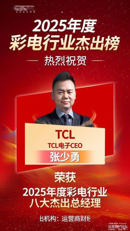 运营商财经网讯 近日,由运营商财经网独家打造的"2025年度彩电行业八大杰出总经理"名单已经确定。经过多方考量, TCL电子CEO张少勇凭借优秀的表现荣获此奖。 运营商财经网副总经理康锐表示,上述成绩的取得,身为TCL电子CEO的张少勇功不可没,在他的带领 下TCL彩电业务通过战略转型和技术革新等方式实现了逆势增长。 运营商财经(官方微信公众号yyscjrd)—— 主流财经网站,一家全面覆盖科技、金融、证券、汽车、 房产、食品、医药、日化、酒业及其他各种消费品网站。 上述评选综合考量了彩电行业各公司的销量、利润、营收等业绩情况,以及高管个人的贡献、行业知名 度等情况,力求全面公正客观。其中,TCL表现格外突出。 在过去的2025年里,TCL彩电业务在全球市场中表现稳健,实现了出货量的逆势增长,市场份额持续提 升,依旧占据着彩电行业龙头位置。此外,张少勇还曾透露,TCL在欧洲、美国的品牌指数都在提升。 ...