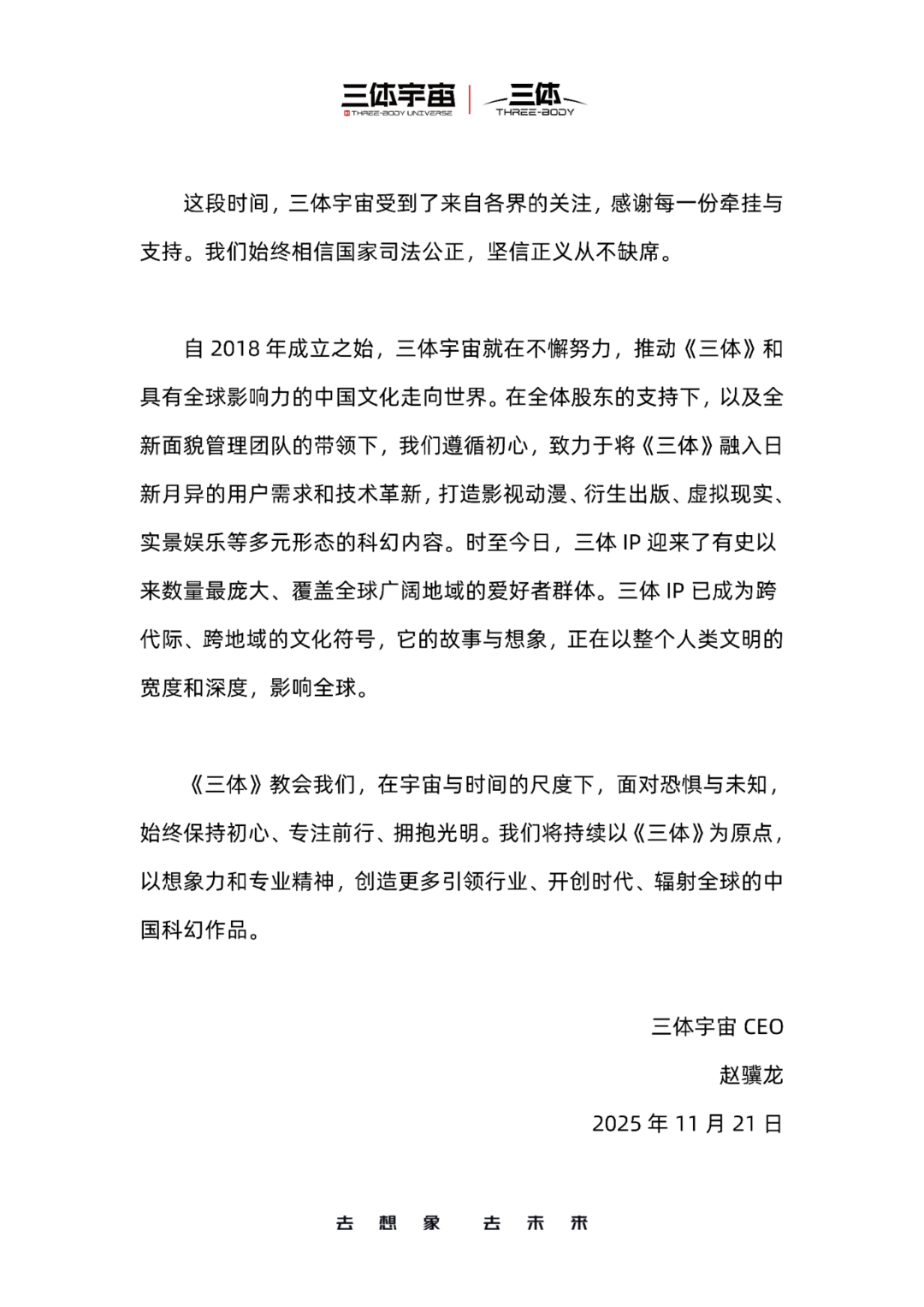 三体宇宙 CEO 赵骥龙 2025 年 11 月 21 日 这段时间,三体宇宙受到了来自各界的关注,感谢每一份牵挂与 支持。我们始终相信国家司法公正,坚信正义从不缺席。 自 2018 年成立之始,三体宇宙就在不懈努力,推动《三体》和 具有全球影响力的中国文化走向世界。在全体股东的支持下,以及全 新面貌管理团队的带领下,我们遵循初心,致力于将《三体》融入日 新月异的用户需求和技术革新,打造影视动漫、衍生出版、虚拟现实、 实景娱乐等多元形态的科幻内容。时至今日,三体 IP 迎来了有史以 来数量最庞大、覆盖全球广阔地域的爱好者群体。三体 IP 已成为跨 代际、跨地域的文化符号,它的故事与想象,正在以整个人类文明的 宽度和深度,影响全球。 《三体》教会我们,在宇宙与时间的尺度下,面对恐惧与未知, 始终保持初心、专注前行、拥抱光明。我们将持续以《三体》为原点, 以想象力和专业精神,创造更多引领行业、开创时代、辐射全球的中 国科幻作品。 家 去 击 这两日,三体公司原CEO许垚毒杀游族董事长林奇案再度受到社会各界的关注。2024年3月上海市第一中级人民法院以犯故意杀人罪判处许垚死刑,剥夺 政治权利终身;以犯投放危险物质罪 ...