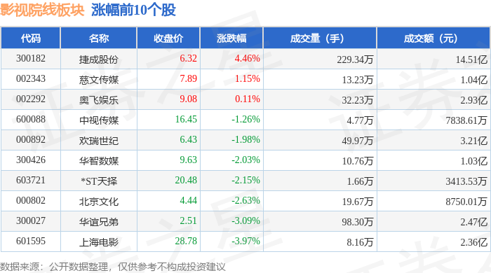 | 代码 | 名称 | 收盘价 | 涨跌幅 | 成交量(手) | 成交额(元) | | | --- | --- | --- | --- | --- | --- | --- | | 300133 | 华策影视 | 8.03 | -13.56% | 201.73万 | | 16.36亿 | | 300251 | 光线传媒 | 17.33 | -10.53% | 162.55万 | | 28.28亿 | | 001330 | 博纳影 / | 5.82 | -10.05% | 49.87万 | | 2.93亿 | | 603103 | 横店影视 | 16.52 | -10.02% | 7.89万 | | 1.31亿 | | 600977 | 中国电影 | 14.08 | -9.97% | 52.59万 | | 7.471Z | | 002739 | 万达电影 | 11.33 | -7.96% | 130.90万 | | 14.98 Z | | 300291 | 百纳千成 | 6.14 | -7.53% | 55.93万 | | 3.45亿 | | 300528 | 幸福蓝海 | 20.17 | -7.05% | 28 ...