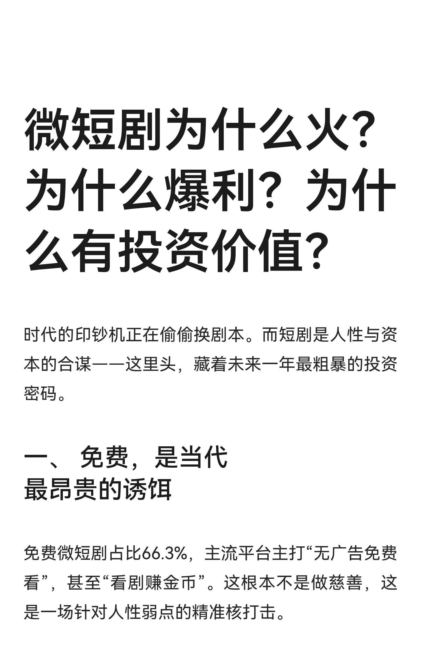 免费微短剧占比66.3%,主流平台主打"ヲ 看",甚至"看剧赚金币"。这根本不是估 是一场针对人性弱点的精准核打击。 时代的印钞机正在偷偷换剧本。而短剧是人性与资本的合谋——这里头,藏着未来一年最粗暴的投资密码。一、 免费,是当代最昂贵的诱饵免费微短剧占 比66.3%,主流平台主打"无广告免费看",甚至"看剧赚金币"。这根本不是做慈善,这是一场针对人性弱点的精准核打击。心理学上这叫"损失厌恶"和"即时 反馈"的超级组合拳。用户为什么疯狂?因为"付费"是痛苦,"免费"是占便宜,"边看边赚钱"更是多巴胺的狂欢。当大家的手机里装上七八个短剧App时,他 们以为自己白嫖了平台,实际上他们的时间和注意力,已经被平台打包成最昂贵的期货,卖给了广告商、电商和资本市场。二、抛弃旧观念,拥抱"注意力 经济"王者不要再盯着那些苦哈哈向用户收会员费的传统长视频平台了。优酷、B站十余年积累的用户,被红果短剧这类平台用"免费+倒贴"的模式瞬间超 越。这说明,谁能更低成本、更高效率地收割全民碎片时间,谁就是下一代流量霸主。要寻找那些深度绑定或自身就是头部短剧平台公司(尽管目前多以在 港股或美股为主,但产业链上下游在A股有映射),它们是直 ...