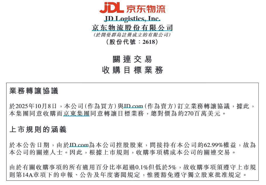 【大河财立方 记者 丁洋涛】10月9日,京东物流(02618.HK)发布公告,宣布已于10月8日与京东集团(JD.com)签署正式协 议,将以约2.7亿美元的对价,全面收购京东集团旗下的本地即时配送服务子公司——达疆及达盛的100%股权,即原达达集团的 本地即时配送业务,收购事项预计于2025年第四季度完成。这标志着京东物流正式将核心的即时配送网络全面纳入麾下,为其供 应链解决方案补上关键一环。 本次收购标的达疆为达达秒送运营主体,是国内即时配送开放平台头部玩家,服务覆盖全国超2800个县区,日均订单处理能力超 千万单,合作客户包括沃尔玛、山姆、麦当劳、瑞幸等连锁品牌;达盛则为2025年1月新设立的香港主体,与达疆共同构成京东 集团即时配送业务核心资产。 公开资料显示,达达集团私有化进程经历了独立上市、私有化和资产剥离的完整周期。公告显示,2023年达达集团亏损6495.9万 元人民币;2024年亏损16118.4万元人民币;2025年实现利润7516.9万元人民币(扭亏为盈);截至2025年6月30日,其账面值为 负7.37亿元人民币。 对于此次收购,快递物流专家、贯铄资本CEO赵小敏认为,从财务层面看,收 ...