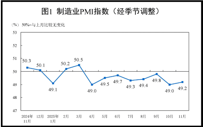 长江商报奔腾新闻记者 李璟 稳增长政策不断落地见效,制造业产需两端均有改善。 国家统计局11月30日发布数据显示,11月份,制造业采购经理指数(PMI)为49.2%,比上月上升 0.2个百分点,制造业稳中有升;非制造业商务活动指数为49.5%,比上月下降0.6个百分点,非制造业 经营活动有所放缓;综合PMI产出指数为49.7%,比上月下降0.3个百分点,我国经济景气水平总体平 稳。 中国物流与采购联合会分析认为,11月份制造业PMI指数小幅回升,表明市场信心有所改善。12月 制造业市场需求仍有趋稳回升空间,并带动企业生产活动稳中有增,年末节庆和冬季消费相关需求集中 释放会带动消费相关服务业有所回升,投资有望继续发挥托底经济的作用。此外,"十五五"发展目标鼓 舞人心,对市场信心产生积极影响。要围绕"十五五"良好开局进一步加强宏观经济政策逆周期调节力 度,显著加大政府公共产品、公共服务投资规模,进一步有效有力带动企业订单增加。 其中,生产指数和新订单指数分别为50.0%和49.2%,比上月分别上升0.3个和0.4个百分点,其中生 产指数升至临界点,产需两端均有改善。 11月份,非制造业商务活动指数为49.5%。其 ...
