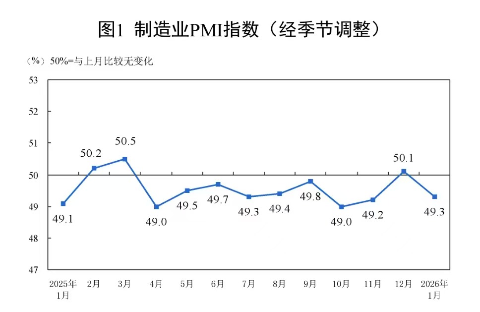 统计局:1月官方制造业PMI为49.3% 比上月下降0.8个百分点
