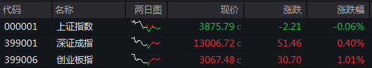 2025.12. 04 本文字数:778,阅读时长大约2分钟 作者 | 一财阿驴 12月4日,沪指、深证成指窄幅震荡;创业板指涨超1%,早盘一度跌超0.5%。截至收盘,沪指跌 0.06%,深成指涨0.4%,创业板指涨1.01%。 | 代码 | 名称 | 两日图 | 现价 | 涨跌 | 涨跌幅 | | --- | --- | --- | --- | --- | --- | | 000001 | 上证指数 | 25 | 3875.79 с | -2.21 | -0.06% | | 399001 | 深证成指 | arm | 13006.72 c | 51.46 | 0.40% | | 399006 | 创业板指 | 1 | 3067.48 с | 30.70 | 1.01% | 盘面上,大消费走弱,零售、餐饮、白酒、电商方向跌幅靠前;铝业、黄金、稀土、房地产行业表现 不振。摩尔线程、商业航天、机器人、半导体概念股走强。 具体来看,机器人概念股走强,日发精机、巨轮智能、四川金顶、和而泰等超10股涨停。 | 代和马 | 名称 | 福特 | 王州十六 | | --- | --- | --- | --- | | 3009 ...