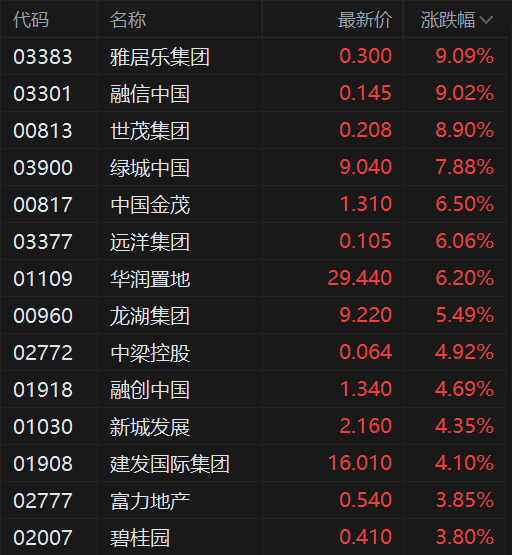 消息上,中金最新指出,2025年12月30日,财政部发布《关于个人销售住房增值税政策的公告》;12月 24日,北京调整限购限贷政策。近期政策有助于提升市场活跃度,后市须重点观察供给侧变化。关注地 产开发和多元板块投资机会。近期房地产市场基本面走势仍偏弱,但政策端持续出现小幅、积极进展。 中金认为仍须持续观察政策和基本面的互动影响,中短期内对房地产开发板块建议适度耐心,优先把握 商业地产领域核心资产的绝对收益机会,和长期竞争力突出且估值逐渐合理的标的;如政策节奏和力度 超预期,对房地产开发板块可更为积极,关注盈利兑现确定性较高的标的,及前端经营趋势良好的公 司。 | 代码 | 名称 | 最新价 | 涨跌幅 √ | | --- | --- | --- | --- | | 03383 | 雅居乐集团 | 0.300 | 9.09% | | 03301 | 融信中国 | 0.145 | 9.02% | | 00813 | 世茂集团 | 0.208 | 8.90% | | 03900 | 绿城中国 | 9.040 | 7.88% | | 00817 | 中国金茂 | 1.310 | 6.50% | | 03377 | ...