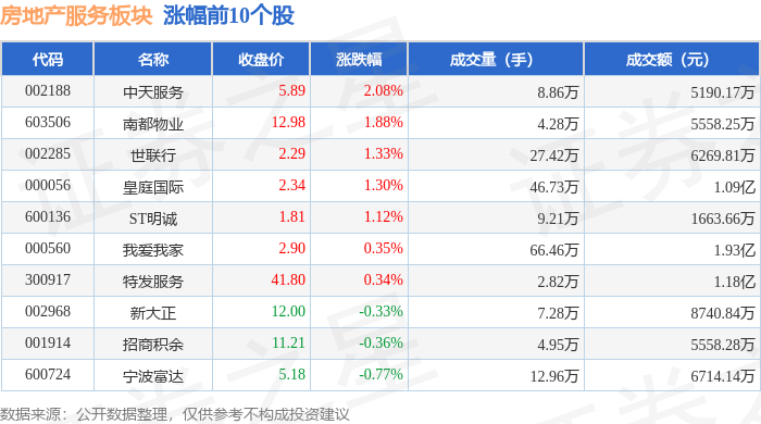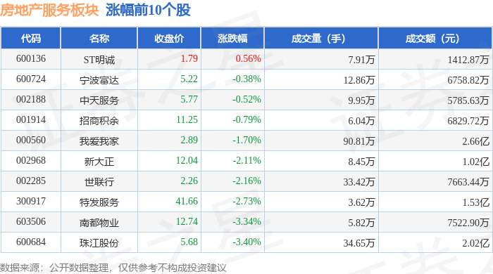 | 代码 | 名称 | 收盘价 | 涨跌幅 | 成交量(手) | 成交额(元) | | --- | --- | --- | --- | --- | --- | | 002968 | 新大正 | 12.67 | 2.10% | 13.35万 | 1.67亿 | | 600684 | 珠江股份 | 5.74 | 1.95% | 21.29万 | 1.21亿 | | 300917 | 特发服务 | 43.31 | 0.63% | 3.90万 | 1.68亿 | | 000056 | 皇庭国际 | 2.43 | 0.41% | 56.89万 | 1.37亿 | | 002188 | 中天服务 | 5.83 | 0.34% | 8.77万 | 5107.96万 | | 000560 | 我爱我家 | 3.00 | 0.33% | 82.15万 | 2.46亿 | | 001914 | 指商积余 | 11.54 | 0.26% | 5.82万 | 6721.43万 | | 600724 | 宁波富达 | 5.34 | 0.19% | 15.69万 | 8350.43万 | | 002285 | 世联行 | 2.34 | ...