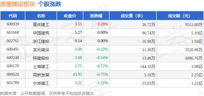 证券之星消息,11月25日房屋建设板块较上一交易日上涨0.05%,高新发展领涨。当日上证指数报收于 3870.02,上涨0.87%。深证成指报收于12777.31,上涨1.53%。房屋建设板块个股涨跌见下表: | 代码 | 名称 | 收盘价 | 涨跌幅 | 成交量(手) | 成交额(元) | | --- | --- | --- | --- | --- | --- | | 000628 | 高新发展 | 44.28 | 1.40% | 5.00万 | 2.21亿 | | 601789 | 宁波建工 | 5.29 | 0.57% | 26.25万 | 1.39 Z | | 600170 | 上海建工 | 2.77 | 0.36% | 142.96万 | 3.95 Z | | 600248 | 陕建股份 | 3.70 | 0.27% | 12.30万 | 4554.61万 | | 600491 | 龙元建设 | 3.09 | 0.00% | 8.14万 | 2527.55万 | | 601668 | 中圖建筑 | 5.27 | 0.00% | 129.09万 | 6.80亿 | | 600939 | 車庆建工 | ...