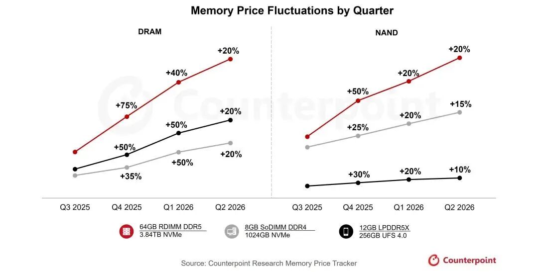 "这种行情十多年没见过了。"李明对21世纪经济报道记者表示,存储芯片厂商的策略是尽力保住Tier1手机客户的需求,但1000元价位段上下的手机出货 预测正被厂商大幅下调。"存储芯片缺货行情下,我们预判手机市场会出现'大浪淘沙'。"他补充道。 多家第三方调研机构也指出,存储芯片价格持续上涨,将令2026年全球手机市场出货量同比由增转降,市场竞争加剧。 持续大涨 当前,全球存储芯片市场正经历前所未有的涨价浪潮。这对以手机为主力产品的终端厂商而言,无疑构成了一场全方位的挑战。 这两年的年末,存储行业从业者李明的状态都颇为紧绷,但其原因又截然不同。 自2025年下半年起,大批下游终端客户主动密集联络李明,寻求价格相对稳定的存储芯片,但李明也难以平衡。对比2024年下半年行业需求呈现的两极分 化格局,当前的存储芯片市场在AI需求的强劲拉动下,已经全面转向卖方市场行情。 图源:Counterpoint Research内存月度价格追踪 "举个例子,过去15年间,4GB的DRAM内存价格最高大约是20美元,但到2025年末已经是40~50美元。这是十多年都没见过的涨价幅度。"李明对记者分 析道,其对手机客户的策略很简单,就 ...