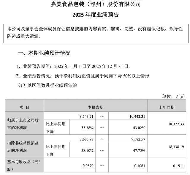 Core Viewpoint - Jia Mei Packaging is forecasting a significant decline in net profit for the fiscal year 2025, with expected earnings between 85.4371 million and 104 million yuan, representing a year-on-year decrease of 43.02% to 53.38% [1][2]. Financial Performance - The net profit attributable to shareholders is projected to be 85.4371 million yuan, down from 104.4231 million yuan in the same period last year, indicating a decline of 53.38% [2]. - The net profit after deducting non-recurring gains and losses is expected to be 76.8397 million yuan, a decrease of 58.10% compared to 9.58257 million yuan last year [2]. - Basic earnings per share are forecasted to be 0.0870 yuan, down from 0.1063 yuan in the previous year [2]. Business Context - The decline in performance is attributed to 2025 being a "small year" for the beverage industry, with fewer days in the Spring Festival peak season and lower-than-expected demand for beverage gift consumption [2][3]. - Despite the anticipated decline, the company maintains that its performance remains stable within the normal average level for a "small year," and it has made significant adjustments to its business and customer structure, reducing reliance on a single major client [3]. Shareholder Changes - Jia Mei Packaging's stock has experienced a notable surge, attributed to a change in control of the company [4]. - The controlling shareholder, China Food Packaging Co., Ltd., is transferring control to Suzhou Zhuyue Hongzhi Technology Development Partnership, with the actual controller changing to Yu Hao [5][6]. - Yu Hao is recognized as the founder and CEO of the well-known technology brand, Dreame Technology, which has become a leading player in the robotic vacuum sector and is expanding into other areas such as major appliances and drones [8].