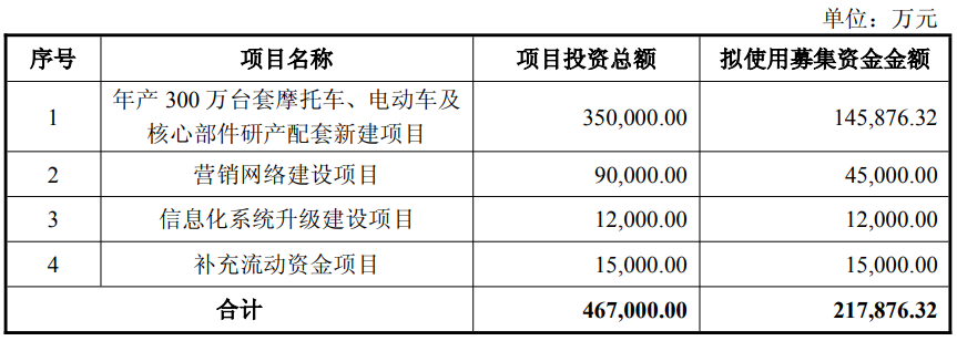 Core Viewpoint - The company plans to issue convertible bonds totaling up to RMB 217,876.32 million to fund various projects, including motorcycle and electric vehicle production, marketing network construction, information system upgrades, and working capital supplementation [1] Fundraising Details - The total amount of convertible bonds to be issued is RMB 217,876.32 million, with the specific amount to be determined by the board of directors or authorized personnel [1] - The net proceeds from the fundraising, after deducting issuance costs, will be allocated to several projects [1] Project Allocations - RMB 145,876.32 million will be used for the construction of a new project with an annual production capacity of 3 million sets of motorcycles, electric vehicles, and core components [1] - RMB 45,000.00 million is allocated for marketing network construction [1] - RMB 12,000.00 million is designated for information system upgrade projects [1] - RMB 15,000.00 million will be used to supplement working capital [1]