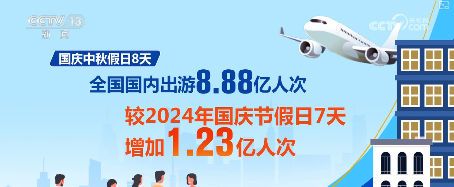刚刚过去的这个国庆中秋假期,各地推出丰富多彩的文化和旅游产品、服务、活动,全国文化和旅游市场总体平稳有序。 经文化和旅游部数据中心测算,国庆中秋假日8天,全国国内出游8.88亿人次,较2024年国庆节假日7天增加1.23亿人次;国内出游 总花费8090.06亿元,较2024年国庆节假日7天增加1081.89亿元。全国举办超2.9万场文旅活动,发放超4.8亿元消费补贴。 消费相关行业日均销售收入同比增4.5% 国家税务总局数据显示,2025年国庆中秋假期,消费市场增势较好。全国消费相关行业日均销售收入同比增长4.5%。 银联网联共处理支付交易13.26万亿元 中国人民银行10月9日发布的数据显示,2025年国庆中秋假期,银联、网联共处理支付交易415.52亿笔,较2024年国庆节假期增加 95.23亿笔;处理支付交易金额13.26万亿元,较2024年国庆节假期增加1.86万亿元。 (责任编辑:王晨曦) 其中,商品消费和服务消费同比分别增长3.9%和7.6%。食品、日用品类商品消费保持较快增长。手机等通讯器材销售收入同比增长 18.8%。汽车销售收入同比增长12.6%,其中新能源汽车同比增长14.7%。 全国重点 ...