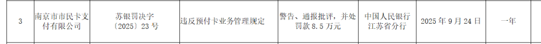 针对上述违法违规行为,中国人民银行江苏省分行对其作出警告、通报批评,并处罚款8.5万元。 | 南京市市民卡支 | 苏银罚决字 | 违反预付卡业务管理规定 | 警告、通报批评,并处 中国人民银行 | 2025 年 9 月 24 日 | 一任 | | --- | --- | --- | --- | --- | --- | | 付有限公司 | (2025) 23 号 | | 罚款 8.5 万元 江苏省分行 | | | 10月9日,中国人民银行江苏省分行发布的行政处罚决定信息公示表。罚单显示,南京市市民卡支付有限公司的主要违法违规事实(案由)为违反预付卡 业务管理规定。 天眼查信息显示,南京市市民卡支付有限公司成立于1999年,位于江苏省南京市,是一家以从事金融业为主的企业。企业注册资本10615万元,已于2017 年完成了战略融资。公司法定代表人为龚毅诚。 ...