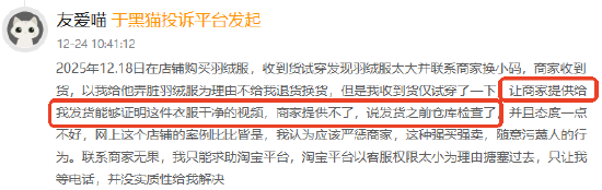 黑猫投诉 【下载黑猫投诉客户端】发布12月企业投诉处理红黑榜单,数据均来源于黑猫投诉平台,反 映了企业在黑猫投诉平台的投诉处理解决情况。 截至2025年12月底,黑猫投诉平台累计收到消费者有效投诉近3195万件,企业回复近2475万件,投诉解 决近2099万件,其中12月有效投诉近79万件。 为了更加精准、及时的展现不同细分消费领域企业在黑猫平台的客诉处理情况,红黑榜单除了按行业划 分,还会根据近期热点消费事件设置"最受关注领域榜单",为消费者提供更有价值的消费参考。 关键词:New Balance虚假拒退,无证据诬陷消费者弄脏商品 本月,多名消费者在黑猫投诉反馈,在New Balance购买商品售后时,退换货遭无理拒绝,商家诬陷商 品脏污却无法提供发货视频;一消费者购买羽绒服,收货试穿后因尺码过大联系商家换小码。商家收到 退回商品后,以羽绒服被弄脏为由拒绝退换。消费者称仅试穿商品,要求商家提供发货时可证明衣物干 净的视频,商家无法提供,仅表示发货前仓库已检查,且沟通态度恶劣。12月New Balance在黑猫投诉 上投诉量为76,回复率为0%。 黑猫投诉12月行业红黑榜单 共享服务 黑榜:光宇科斯特换电、智 ...