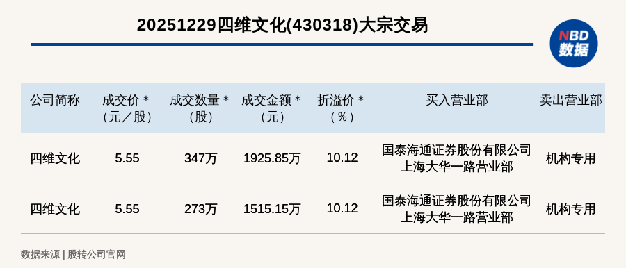 免责声明:本文内容与数据仅供参考,不构成投资建议,使用前核实。据此操作,风险自担。 每经讯,2025年12月29日,新三板创新层公司四维文化(430318,收盘价:5.04元)发生2笔大宗交易,总成交金额为3441万 元,成交金额最高的一笔成交价5.55元/股,成交数量347万股,成交金额1925.85万元,溢价10.12%。买入营业部是国泰海通证 券股份有限公司上海大华一路营业部,卖出营业部是机构专用。 (记者 曾健辉) 每日经济新闻 ...