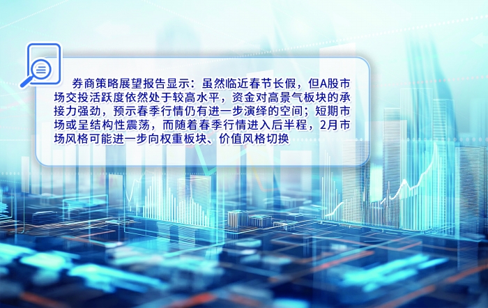 券商策略展望报告显示:虽然临近春节长假,但A股市场交投活跃度依然处于较高水平,资金对高景气 板块的承接力强劲,预示春季行情仍有进一步演绎的空间;短期市场或呈结构性震荡,而随着春季行情 进入后半程,2月市场风格可能进一步向权重板块、价值风格切换。 春季行情继续向纵深演绎 上周,凯文·沃什获得美联储主席提名,国际贵金属价格剧烈波动,美股下跌,美元、美国长端利率上 行,全球风险资产普遍走弱。 周恒 制图 ◎记者 汪友若 上周,A股市场板块轮动速度加快,前期表现较好的部分计算机、新能源概念有所回调,以白酒、地产 为代表的前期滞涨资产则表现相对亮眼。此外,受国际贵金属价格在持续上涨后高位巨震影响,上周五 有色金属板块大幅回调。 "综合来看:一方面,年度业绩预告继续验证上市公司盈利改善趋势,本轮盈利修复值得期待;另一方 面,2月产业和宏观层面的密集催化,对于结构性机会的指引也值得期待。这些因素将推动春季行情继 续向纵深演绎。"兴业证券认为。 对此,华西证券分析认为,在外部扰动加剧的背景下,A股行情近期出现阶段性休整迹象,但中期视角 下本轮行情仍有充足空间和机会。从微观流动性来看,股票型ETF净流出调节交易节奏,但整体市场 ...