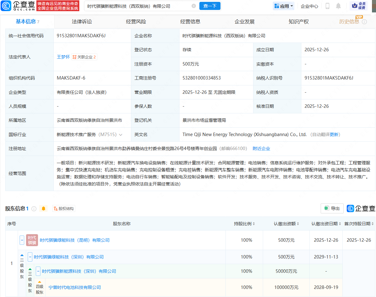 | 股东信息1 ① ● E= 股权结构 | | | | | 책 음田 | | --- | --- | --- | --- | --- | --- | | 序号 | 股东名称 | | 持股比例 ÷ | 认缴出资额 # | 认缴出资日期 : | | 时代 时代骐骥绿能科技(昆明)有限公司 骐骥 | | | 100% | 500万元 | 2025-12-26 | | - 时代張骥绿能科技(深圳)有限公司 | | | 100% | 500万元 | 2029-11-13 | | 班 股 股 治 | - 时代骐骥新能源科技 (深圳)有限公司 | | 100% | 50000万元 | | | 設 | 四级 宁普时代电池科技有限公司 东 股东 | | 100% | 100000万元 | 2028-09-19 | | © 12 查看 缔造有远见的商业传奇 全国企业信用查询系统 | 宁普时代电池科技有限公司 | 8 | | | | | 基本信息 234 | 法律诉讼 4 | 经营风险 23 经营信息 3 | | | | | 股东信息 1 ♠ E 股权结构 | | | | | | | 股东信息 2 | VIP VIP 历史股东信息 ...
