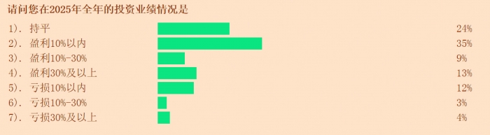 | 4). 4300点附近 | 16% | | --- | --- | | 5). 4400点附近 | 22% | | 6). 4500点及以上 | 10% | (感谢申万宏源证券、东北证券相关营业部对本调查的支持。上图为部分调查结果) □ 伴随着A股主要指数在2025年全线收红,近六成受访投资者实现盈利。其中,以人工智能为代表的核 心热点板块在2025年持续上涨,成为贡献投资收益的主要来源 □ 在无风险利率持续下行的背景下,随着股市赚钱效应不断增强,居民存款向权益资产"搬家"的现象在 2025年初现端倪 □ 近八成投资者看涨2026年股市,并且对春季行情充满期待。值得一提的是,投资者对今年上证综指波 动范围的预期"乐观但不激进",倾向于在指数稳健运行的背景下,把握结构性机会而非博弈指数大幅突 破 ◎记者 汪友若 投资收益连续两年上升 纵观2025年全年,主要宽基股指均在当年4月初触底后一路高歌猛进。上证综指从年内低位的3040.69点 起步,一度冲破4000点大关,全年涨幅接近20%,创下近六年来最佳年度表现;科技含量更高的创业板 指和科创综指全年涨幅更是接近50%。 市场行情的向好直接惠及广大投资者,近六 ...
