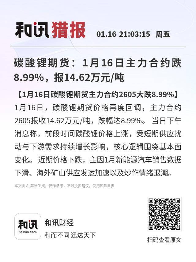 【1月16日碳酸锂期货主力合约2605大跌8.99%】1月16日,碳酸锂期货价格再度回调,主力合约2605报 收14.62万元/吨,跌幅达8.99%。当日下午消息称,前段时间碳酸锂价格上涨,受短期供应扰动与下游 需求持续增长影响,核心逻辑围绕基本面变化。近期价格下跌,主因1月新能源汽车销售数据下滑、海 外矿山供应发运加速以及炒作情绪退潮。 本文由 AI 算法生成,仅作参考,不涉投资建议,使用风险自担 ...
