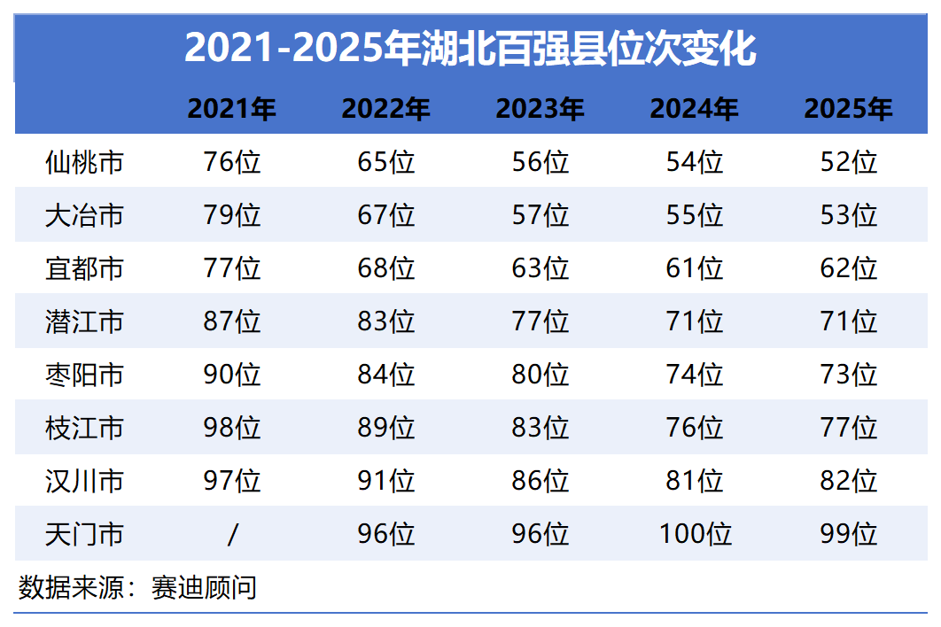 记者丨吴文汐 编辑丨李果 作为经济体系中的基本单元,当前,湖北县域经济总量支撑起全省的"半壁江山"。如果总结复 盘湖北"十四五"期间县域经济发展的成色,可以提炼出两大关键词: 一个是"进位提质"。" 十四五"期间,湖北百强县数量稳居中部第一、全国第四,百强县集体 排名跃升,仙桃跻身"千亿县俱乐部",宜都、潜江、汉川、大冶、枝江等5地组成"准千亿 县"储备梯队。 另一个是"特色生长"。 2024年,湖北首评县域特色产业集群,拿出8000万元真金白银激励县 域强特色、提质效。宜都的新能源材料、汉川的纺织服装、仙桃的无纺布、大冶的先进金属材 料......一批"搬不走、稳得住"的特色产业在湖北县域崛起。 2025年12月25日召开的湖北省委经济工作会议上,明确提出要"'一县一业'培育县域特色产业 集群,加快百强县进位、千亿县扩容,推动'双20'结对帮扶、'双百'科技赋能"。这一系列举 措,精准锁定了县域经济这一高质量发展的"底盘"。 面向"十五五",随着更多的"准千亿县"梯次突破、县域特色产业集群持续壮大,湖北县域经济 或将迎来一场深刻的蜕变。 千亿县扩容"蓄势待发" 湖北省内现有26个县级市、35个县。2024年 ...
