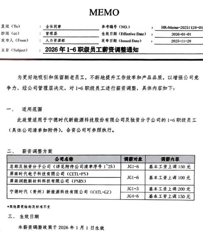 近日,"宁德时代发布涨薪通知"瞬间登上各大热搜平台! | 星送(To) | : 全体同事 | 参考编号(NO.) | HR-Memo-20251128-01 | | --- | --- | --- | --- | | 抄送(cc) | : 管理层 | 生效日期(Effective Date) | 2026-01-01 | | 发布人(From) | : 人力资源都 | 发布日期(Issued Date) | 2025-11-28 | | 主旨(Subject) | : 2026年1-6 职级员工薪资调整通知 | | | | 公司名称 | 调薪对象 | 调薪内容 | | --- | --- | --- | | 总额及独资分子公司(详见附件公司清单序号1~25) | JG1-6 | 基本工资上调 150元 | | 屏南时代电子科技有限公司(CETL-PN) | JG1-6 | 基本工资上调 100元 | | 屏南润能新材料科技有限公司(PNRY) | | | | 宁德时代(贵州)新能源科技有限公司(CATL-GZ) | JC1-3 | 基本工资上调 200元 | | | JG4-6 | 基本工资上请 150元 | ...