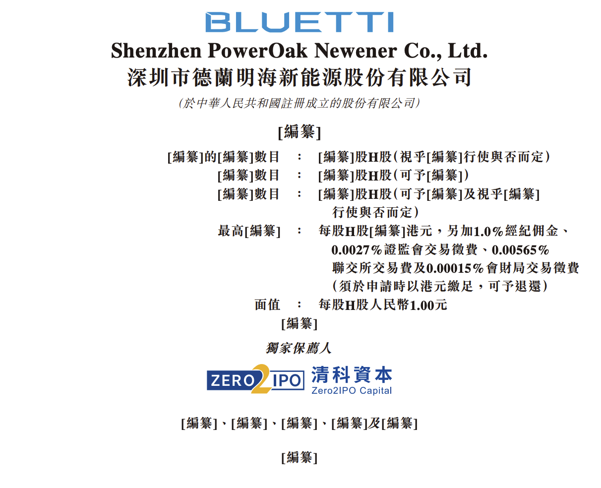 [編纂] 最高[编纂] ·· 每股H股[編纂]港元,另加1.0%經紀佣 0.0027%證監會交易徵費、0.005659 聯交所交易費及0.00015%會財局交! (須於申請時以港元繳足,可予退還 据港交所文件,2月15日,深圳市德兰明海新能源股份有限公司向港交所递交上市申请,清科资本为独家保荐人。 BLUETTI Shenzhen PowerOak Newener Co., Ltd. 深圳市德蘭明海新能源股份有限公司 (於中華人民共和國註冊成立的股份有限公司) 獨家保薦人 ZERO IPO] 清科資本 [編纂]、[編纂]、[編纂]及[編纂] [繼臺] 「編纂]的[編纂]數目 「編纂]股H股(視乎[編纂]行使與否而定 .. 「編纂]數目 「編纂]股H股(可予[編纂]) o o [编纂]數目 「編纂]股H股(可予[編纂]及視乎[編纂] 。 行使與否而定) 面值 : 每股H股人民幣1.00元 [编纂] ...