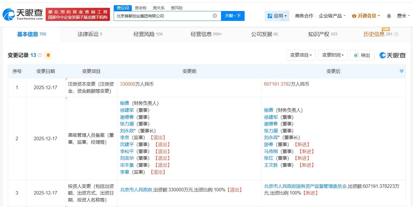 每经AI快讯,天眼查App显示,近日,北京首都创业集团有限公司发生工商变更,原股东北京市人民政府退出,新增北京市人民政府国有资产监督管理委员 会为全资股东,注册资本由33亿元人民币增至约60.7亿元人民币,增幅约84%,同时,多位高管发生变更。该公司成立于1994年10月,法定代表人为刘永 政,经营范围包括购销包装食品、医疗器材,授权范围内的国有资产经营管理等。 | ● 大眼管 | | 都在用的商业查询工具 | 更公司 查老板 查关系 查风险 | | | | | | --- | --- | --- | --- | --- | --- | --- | --- | | | | 国家中小企业发展了基金旗下机构 | 北京首都创业集团有限公司 | 8 | 天眼一下 | 品 应用 ▼ | 商务合作 | | 基本信息 700 | | 法律诉讼 9 | 经营风险 106 | 经营信息 999+ | | 公司发展 66 | 知识 | | 变更记录 13 2 @ | | | | | | | 变更项目 · | | 序号 | 变更日期 | 变更项目 | | 变更前 | | | | | 1 | 2025-12-17 | 注册资本变更( ...