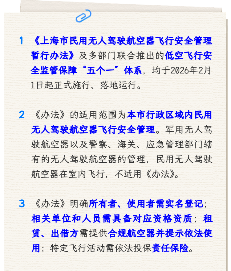 Core Viewpoint - The Shanghai Municipal Government has issued the "Interim Measures for the Safety Management of Civil Unmanned Aerial Vehicle Flights," effective from February 1, 2026, to regulate the operation of civil drones and promote the healthy development of the drone industry while ensuring aviation, public, and national security [1]. Group 1: Background and Purpose - The measures were developed in response to the rapid growth of the low-altitude economy and the widespread use of civil drones in various fields, which have significantly contributed to economic and social development. However, incidents of unauthorized drone flights have raised public safety concerns [3]. - The need for these measures arises from the implementation of national regulations, including the "Interim Regulations on the Management of Unmanned Aerial Vehicle Flights" issued on May 31, 2023, and the "Safety Management Rules for Civil Unmanned Aerial Vehicle Operations" by the Ministry of Transport, effective January 1, 2024 [3]. Group 2: Scope and Requirements - The measures apply to the safety management of civil unmanned aerial vehicle flights within the administrative region of Shanghai, excluding military drones and those operated by police, customs, and emergency management departments, as well as indoor flights [4]. - Owners and users of civil drones are required to register their identities and comply with qualifications for operating drones as stipulated in the national regulations. Rental operators must provide drones that meet legal and safety standards [4]. Group 3: Flight Activity Regulations - The measures specify which flight activities require prior approval and outline the application process, including submitting flight plans to air traffic management authorities at least 12 hours before the intended flight [5][6]. - A user-friendly application service will be available through the "Shangyin Ban" platform to facilitate the submission of flight activity applications and flight plan filings [6]. Group 4: Safety Management Provisions - Users of civil drones are held responsible for flight safety and must develop emergency response plans in accordance with national and local safety regulations [7][8]. - Drones must update safety data in real-time and cannot disable reporting functions during operation. Specific prohibitions, such as invading privacy, are also outlined [9][10]. - In case of abnormal situations during flight, operators are required to take immediate action and report to the municipal flight service agency [11]. Group 5: Implementation of the "Five Ones" System - The "Five Ones" system includes a collaborative mechanism for information sharing and joint regulation among various departments, aiming to enhance cross-sector governance [12]. - The measures will be supported by a comprehensive regulatory service platform launching on February 1, which will allow users to complete drone registration, flight applications, and experience zone reservations through a single interface [12][13].
