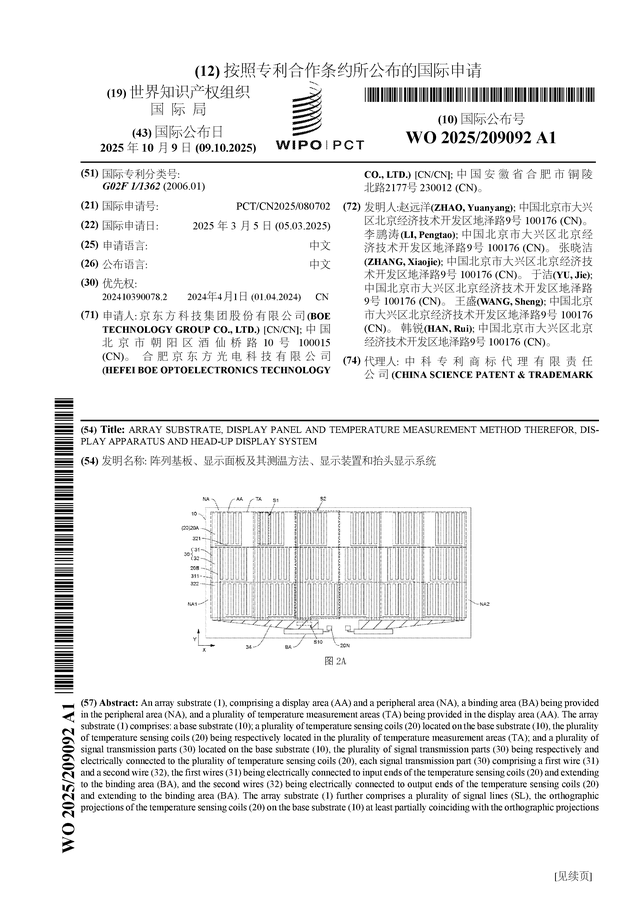 京东方A公布国际专利申请:“阵列基板、显示面板及其测温方法、显示装置和抬头显示系统”