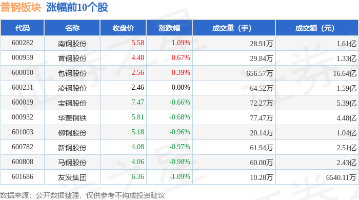| 代码 | 名称 | 收盘价 | 涨跌幅 | 成交量(手) | 成交额(元) | | --- | --- | --- | --- | --- | --- | | 600307 | 酒钢宏兴 | 1.66 | -3.49% | 76.85万 | 1.29亿 | | 600581 | 八一钢铁 | 3.66 | -3.43% | 52.49万 | 1.92亿 | | 600569 | 安阳钢铁 | 2.46 | -3.15% | 49.74万 | 1.23亿 | | 600022 | 山东钢铁 | 1.55 | -3.12% | 153.36万 | 2.39亿 | | 603878 | 武进不锈 | 9.58 | -3.04% | 14.17万 | 1.37亿 | | 000717 | 中南股份 | 2.69 | -2.89% | 41.57万 | 1.13亿 | | 601005 | 重庆钢铁 | 1.51 | -2.58% | 183.40万 | 2.79亿 | | 000761 | 本钢板材 | 3.50 | -2.51% | 17.36万 | 6111.70万 | | 600126 | 杭钢股份 | 9 ...