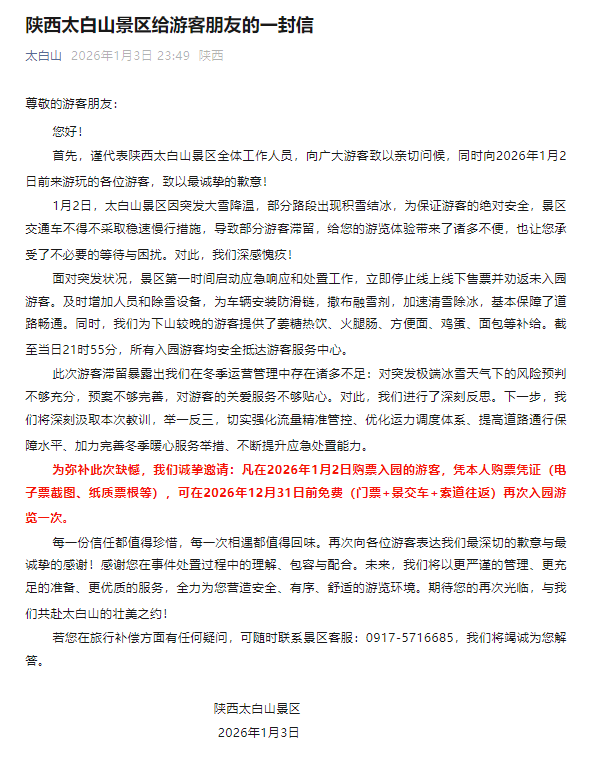 新京报讯 1月3日,陕西太白山景区发布给游客朋友的一封信,内容如下: 尊敬的游客朋友: 您好! 首先,谨代表陕西太白山景区全体工作人员,向广大游客致以亲切问候,同时向2026年1月2日前来游玩 的各位游客,致以最诚挚的歉意! 每一份信任都值得珍惜,每一次相遇都值得回味。再次向各位游客表达我们最深切的歉意与最诚挚的感 谢!感谢您在事件处置过程中的理解、包容与配合。未来,我们将以更严谨的管理、更充足的准备、更 优质的服务,全力为您营造安全、有序、舒适的游览环境。期待您的再次光临,与我们共赴太白山的壮 美之约! 陕西太白山景区给游客朋友的一封信 太白山 2026年1月3日 23:49 陕西 尊敬的游客朋友: 您好! 首先,谨代表陕西太白山景区全体工作人员,向广大游客致以亲切问候,同时向2026年1月2 目前来游玩的各位游客,致以最诚挚的歉意! 1月2日,太白山景区因突发大雪降温,部分路段出现积雪结冰,为保证游客的绝对安全,景区 交通车不得不采取稳速慢行措施,导致部分游客滞留,给您的游览体验带来了诸多不便,也让您承 受了不必要的等待与困扰。对此,我们深感愧疚! 1月2日,太白山景区因突发大雪降温,部分路段出现积雪结冰 ...