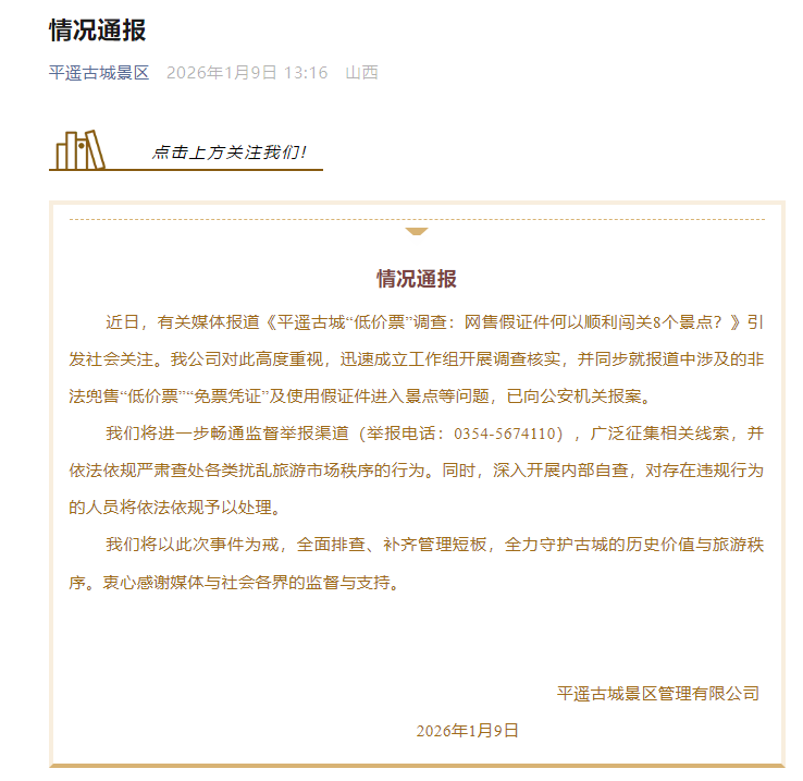 每经AI快讯,山西平遥古城景区管理有限公司1月9日通报:近日,有关媒体报道《平遥古城"低价票"调 查:网售假证件何以顺利闯关8个景点?》引发社会关注。公司对此高度重视,迅速成立工作组开展调查 核实,并就报道中涉及的非法兜售"低价票""免票凭证"及使用假证件进入景点等问题,已向公安机关报 案。 (文章来源:每日经济新闻) ...
