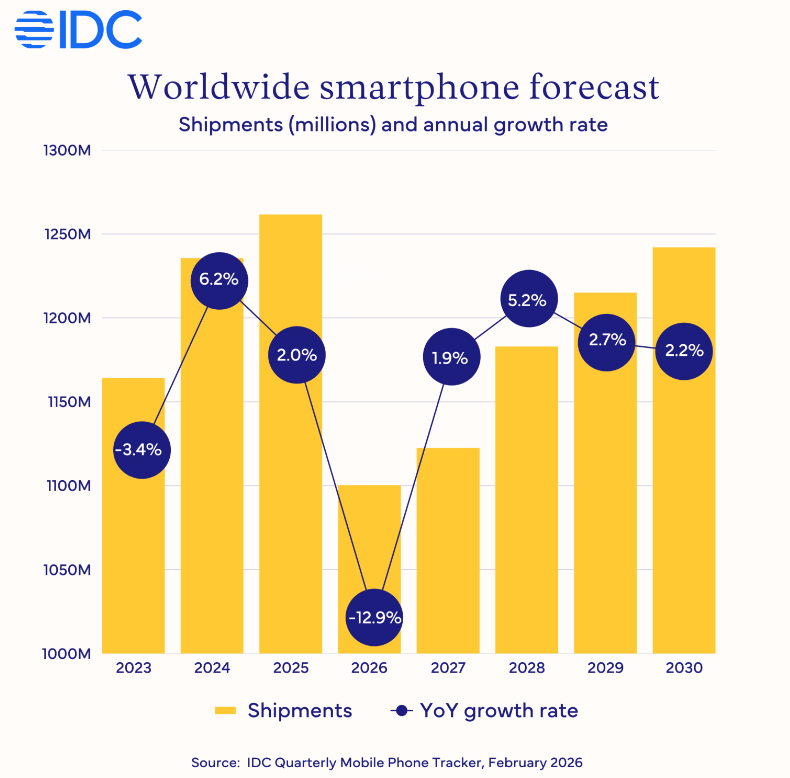 (来源:SMTJS资讯) "廉价智能手机的时代已经结束,即便危机过去,我们预计存储芯片价格也不会回落至2025年的水平,"Popal表 示。去年,价格低于100美元的智能手机出货量约为1.7亿部。IDC称,这一细分市场如今已不具盈利性。 (来源:SMTJS资讯) 研究机构IDC表示,受前所未有的存储芯片短缺影响,2026年全球智能手机市场将萎缩12.9%,至11.2亿部。这 一降幅将使智能手机市场年度出货量降至十多年来的最低水平。 研究机构IDC表示,受前所未有的存储芯片短缺影响,2026年全球智能手机市场将萎缩12.9%,至11.2亿部。这 一降幅将使智能手机市场年度出货量降至十多年来的最低水平。 从区域来看,低端智能手机集中度较高的市场预计将出现最大幅度的下滑。中东和非洲地区的降幅将最大,同 比下降20.6%,而全球最大的两个市场--中国和除中国和日本外的亚太地区预计分别下降10.5%和13.1%。随着危 机在2027年中期开始趋于稳定,IDC预测当年将出现2%的温和复苏,随后在2028年将出现更强劲的反弹,同比 增长5.2%。 "与这场危机相比,关税和疫情危机都显得微不足道,"IDC高级研究总监Nabi ...