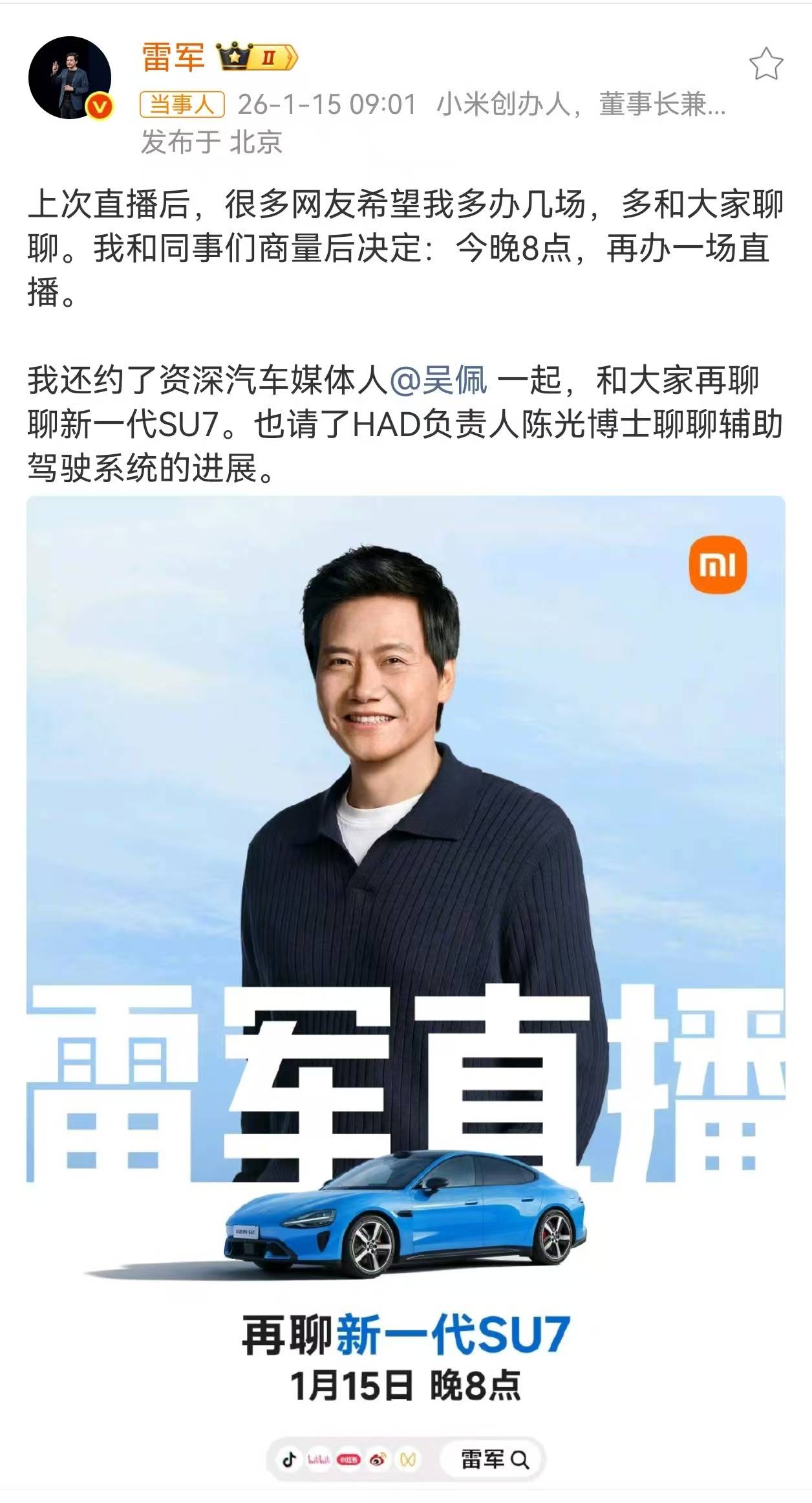 小米集团创始人、董事长兼CEO雷军1月15日在其个人微博发布直播预告。他表示,今晚8点,再办一场直播,再聊新一代SU7。 上证报中国证券网讯(记者 刘暄)小米集团创始人、董事长兼CEO雷军1月15日在其个人微博发布直播预告。他表示,今晚8点,再办一场直播,再聊新一 代SU7。 雷军称,此次直播邀请到资深汽车媒体人吴佩现场做客,小米HAD负责人陈光博士也将参与直播,详解辅助驾驶系统的最新进展。 上海证券报记者注意到,这是雷军2026年开年以来的第三场直播。今年1月3日及1月7日,雷军已先后两次开播,直播内容涉及小米YU7车型拆解、回应网络 质疑、新一代小米SU7的相关情况。 ...