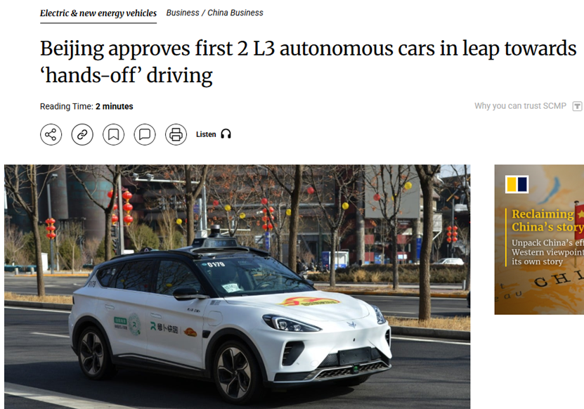 【环球网财经综合报道】日前,节能与新能源汽车产业发展部际联席会议2026年度工作会议强调,要提升产业链供应 链自主可控能力,加快突破全固态电池、高级别自动驾驶等技术。进一步扩大汽车消费,推动新能源重卡规模化应 用,深化新能源汽车保险改革。 具体来看,"模速智行"行动计划提出,开展L3级自动驾驶乘用车的上路通行试点,在智能公交、智能出租、智能重卡 等场景规模化应用L4级自动驾驶技术,L4级自动驾驶汽车实现量产。 报道还提到,目前大多智能汽车仍为L2级,L3要求驾驶员在部分情况下保持警觉;这标志着中国朝着更广泛部署自动 驾驶技术迈进,且可能预示市场管制的放宽,自动驾驶技术和需求在该领域正快速增长。 《南华早报》此前发文称,在过去几年里,配备了初步自动驾驶系统的汽车在中国内地的销量大幅增长,这得益于中 国消费者对新技术的接受度提升。据电动汽车100秘书长张勇伟介绍,今年中国内地销售的新车上,每三辆中有两辆 会有L2或更高级别的自动驾驶功能。 1月14日,上海市经济和信息化委员会、上海市交通委员会、上海市公安局印发《上海高级别自动驾驶引领区 "模速智 行"行动计划》。其中提到,按照"模型驱动引领、应用示范带动、产业协 ...