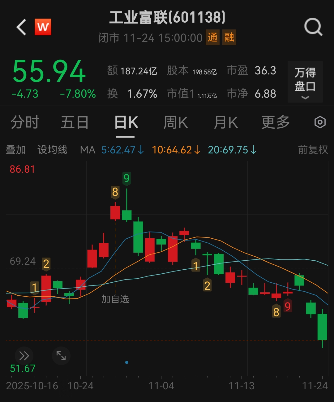 Core Viewpoint - Industrial Fulian's stock price has experienced significant volatility, dropping over 30% from its peak, resulting in a market value loss exceeding 500 billion yuan within a short period [1][3]. Financial Performance - For the first three quarters of 2023, Industrial Fulian reported a revenue of 603.93 billion yuan, representing a year-on-year growth of 38.4%, and a net profit attributable to shareholders of 22.49 billion yuan, up 48.52% year-on-year [3]. Stock Market Reaction - On October 29, following the release of its quarterly report, Industrial Fulian's stock price surged over 9%, closing at 80.8 yuan per share, with a market capitalization reaching 1.6 trillion yuan, a historical high [3]. - On November 24, the stock price fell to 54.61 yuan per share, marking a decline of 9.99% by midday, and ultimately closing at 55.95 yuan, down 7.80% for the day, with trading volume exceeding 18.7 billion yuan [2]. Market Speculation and Response - A circulating rumor suggested that Nvidia would enter the server market, leading to a potential downward revision of Industrial Fulian's revenue expectations for Q4 2025, which contributed to the stock's decline [3][4]. - Industrial Fulian issued a clarification stating that the rumors regarding a downward adjustment of Q4 performance targets were unfounded, asserting that operations and customer demand remained strong [4][5]. Management's Outlook - During a quarterly earnings call, management expressed confidence in ongoing projects and customer demand, indicating that the company had not adjusted its performance expectations despite market speculation [5][6]. - Analysts have deemed the rumors about Nvidia's market entry as unreliable, emphasizing that such a move would not align with Nvidia's profit strategy [6]. Industry Context - Other companies in the computing power sector also experienced stock price declines during the same period, with notable drops including 10.96% for Zhongji Xuchuang, 28.64% for Xinyi Sheng, and 23.74% for Tianfu Communication [6].