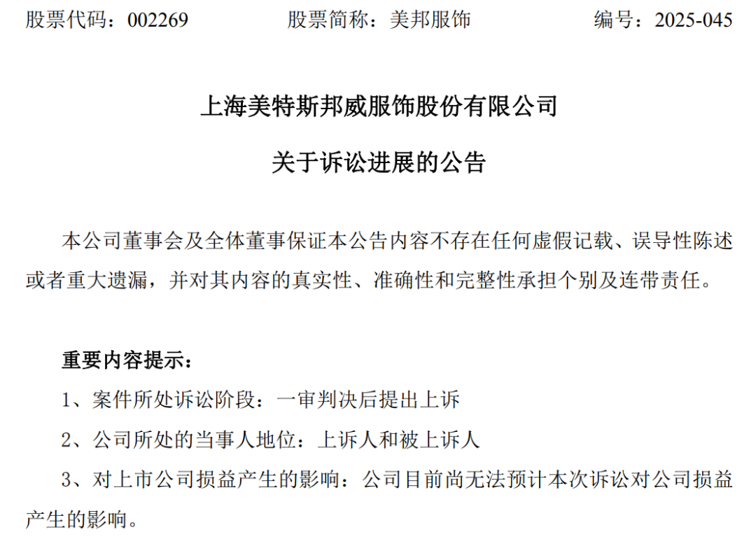 11月27日晚间,国产服装的昔日龙头美邦服饰(002269)(002269)发布诉讼进展公告称,公司与承租方上海鸿鼎投资管理有限公司(简称"鸿鼎投资") 的租赁合同纠纷在一审判决后,双方均已向上海市第一中级人民法院提起上诉。目前二审受理及开庭时间尚未明确,公司暂无法预计该诉讼对本期或期后 利润的影响。 据公告披露,公司于2023年将公司位于上海浦东新区康桥东路800号园区部分出租给鸿鼎投资,2024年因租赁合同纠纷事项向上海市浦东新区人民法院起 诉鸿鼎投资,并于2025年3月31日正式解除租赁合同,后于5月变更诉讼请求。 2025年11月,公司收到浦东法院出具的一审民事判决书,随后双方均提起上诉。 作为上诉人,美邦服饰上诉请求包括:撤销一审判决第四项、第六项;改判鸿鼎投资自2025年4月1日起至实际返还房屋之日止,按每日85287.67元(约 8.53万元)标准支付房屋占用使用费;改判鸿鼎投资支付免租期租金2334.75万元;并要求鸿鼎投资承担一、二审全部诉讼费用。 美邦服饰认为,原审判决虽然支持了其部分诉讼请求,但在房屋占用使用费的计算标准以及免租期租金的处理上存在事实认定不清、法律适用不当之处, 导致对上 ...