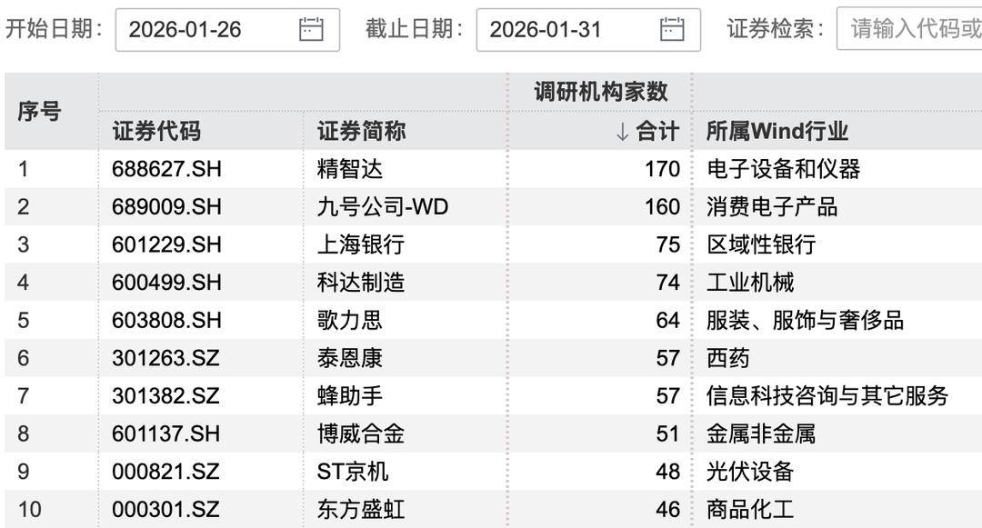 精智达接受170家机构调研。 该笔订单是市场对公司长期投入的高度肯定。这不仅是订单金额的重要突破,更充分验证了公司技术路线的正确性和市场地位的稳固性;在国际供应商交 期紧张的当下,这份订单凸显了公司在国产供应链中的核心竞争力。 记者注意到,机构调研上市公司热情不减。机械设备、计算机等行业调研热度持续,电子、机械设备行业,近5天接受调研机构家数位居前列,相关上市 公司被调研频率较高。 扬子晚报网2月1日讯(记者范晓林薄云峰)1月份的最后一个工作周(1月26日—1月30日),精智达接受170家机构调研,成为同期获机构调研家数最多的上市 公司。公司近期签订13.11亿元半导体测试设备销售合同备受市场关注。 精智达1月23日公告,公司控股子公司合肥精智达集成电路技术有限公司与客户签订日常经营性销售合同,合同标的为半导体测试设备及其配套治具,合 同总金额13.11亿元(含税)。 | 开始日期: | 2026-01-26 | រួ 截止日期: | 2026-01-31 | I 证券检索: 请输入代码或 | | --- | --- | --- | --- | --- | | 序号 | | | 调研机构家数 | | | | ...