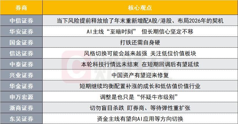 中信证券:当下风险提前释放给了年末重新增配A股/港股、布局2026年的契机 11月23日,十大券商最新策略观点新鲜出炉,具体如下: | 券商 | 核心观点 | | --- | --- | | 中信证券 | 当下风险提前释放给了年末重新增配A股/港股、布局2026年的契机 | | 华安证券 | AI主线"至暗时刻" 但长期信心坚定不移 | | 国金证券 | 打铁还需自身硬 | | 信达证券 | 风格切换可能会越来越强 关注低位价值板块 | | 中泰证券 | 本轮科技行情远未结束 在短期回调后有望延续 | | 兴业证券 | 中国资产有望迎来修复 | | 非金证券 | 短期继续均衡配置补涨的成长和低估值价值行业 | | 申万宏源 | 调整是也只是"怀疑牛市级别" | | 浙商证券 | 切勿盲目杀跌 盯券商、等待弹性重扩张 | | 东吴证券 | 资金主线有望向AI应用等方向切换 | 全球风险资产的波动表面是流动性问题,本质是风险资产对于AI单一叙事过于依赖,当产业发展速度(尤其是商业 化)跟不上二级市场的节奏时,适当的估值修正也是一种纾解风险的方式。北京时间周四(11月20日)晚,美国非农 就业数据的公布以及年内美联 ...