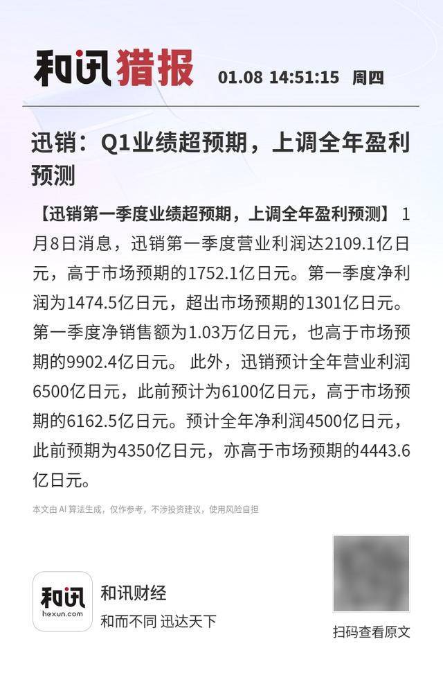 【迅销第一季度业绩超预期,上调全年盈利预测】1月8日消息,迅销第一季度营业利润达2109.1亿日 元,高于市场预期的1752.1亿日元。第一季度净利润为1474.5亿日元,超出市场预期的1301亿日元。第 一季度净销售额为1.03万亿日元,也高于市场预期的9902.4亿日元。此外,迅销预计全年营业利润6500 亿日元,此前预计为6100亿日元,高于市场预期的6162.5亿日元。预计全年净利润4500亿日元,此前预 期为4350亿日元,亦高于市场预期的4443.6亿日元。 本文由 AI 算法生成,仅作参考,不涉投资建议,使用风险自担 【迅销第一季度业绩超预期,上调全年盈利预测】 1 月8日消息,迅销第一季度营业利润达2109.1亿日 元,高于市场预期的1752.1亿日元。第一季度净利 润为1474.5亿日元,超出市场预期的1301亿日元。 第一季度净销售额为1.03万亿日元,也高于市场预 期的9902.4亿日元。 此外,迅销预计全年营业利润 6500亿日元,此前预计为6100亿日元,高于市场预 期的6162.5亿日元。预计全年净利润4500亿日元, 此前预期为4350亿日元,亦高于市场预期的4443.6 亿日元 ...